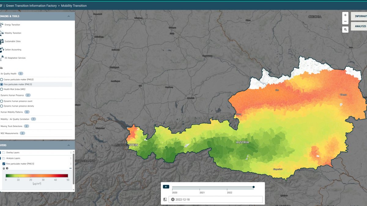 Im Rahmen der Green Transition Information Factory (GTIF), eine Initiative der European Space Agency (ESA), wurde für Österreich ein „Digitaler Zwilling“ entwickelt, um den grünen und digitalen Wandel voranzutreiben. Die Systemebenen der Satelliten- und Geodaten sind anschaulich in einem interaktiven Demonstrator auf der Website dargestellt, die Themengebiete sind: Energiewende, Nachhaltige Städte, Mobilitätswende, Anpassungsdienste mit Erdbeobachtung und Kohlenstoffbilanzierung. Die spielerischen Visualisierungen laden Stakeholder*innen und Bürger*innen ein, etwa das Solarpotenzial ihrer Stadt oder die Biomasse der Umgebung zu erkunden.